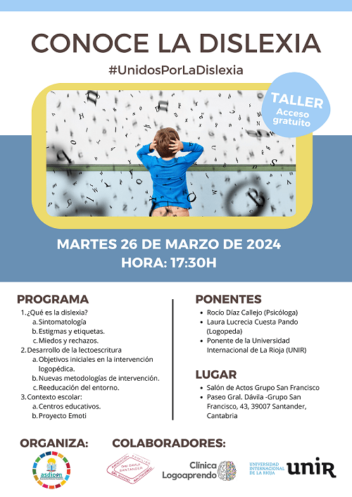 Bajo el lema «Conocer la Dislexia», esta jornada se llevará a cabo el próximo martes 26 de marzo a las 17:30 horas en el Salón de Actos Grupo San Francisco, Santander, con acceso gratuito para todos los interesados.
